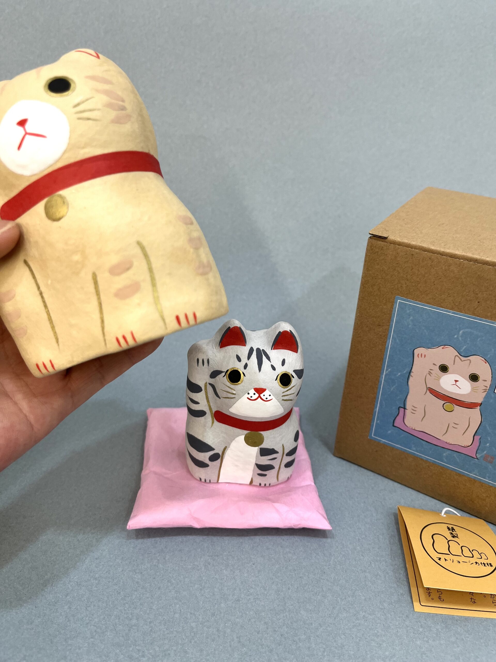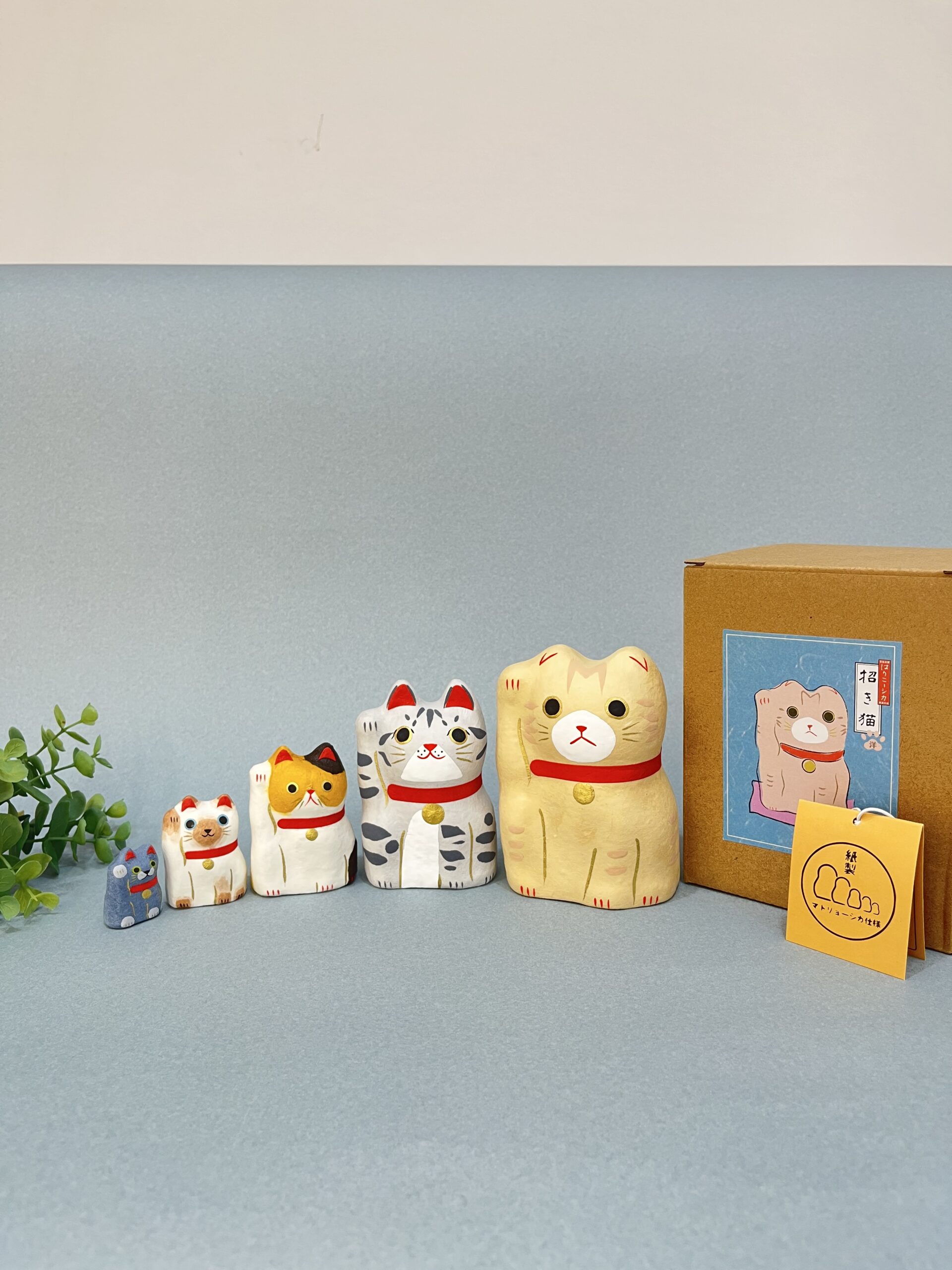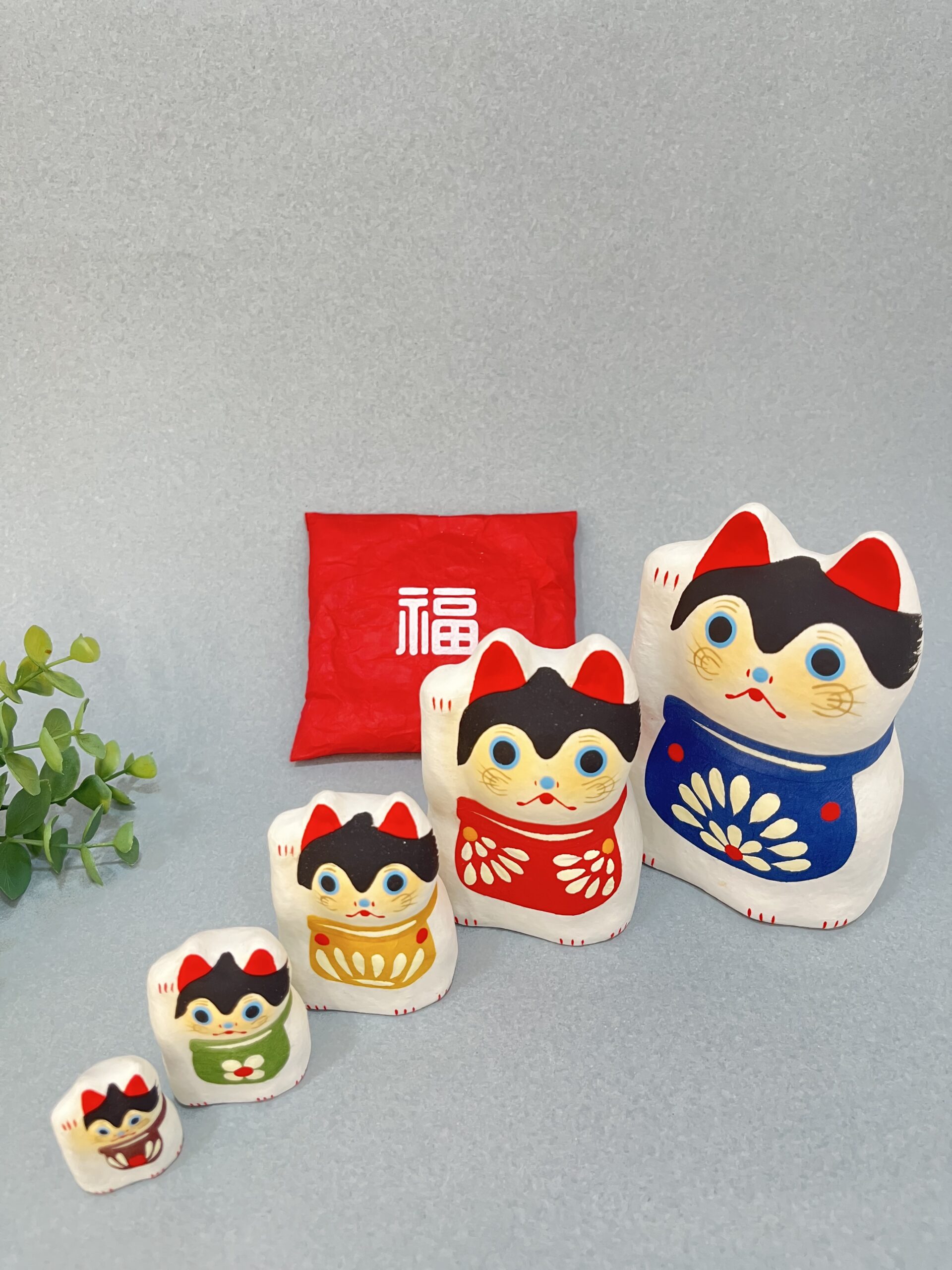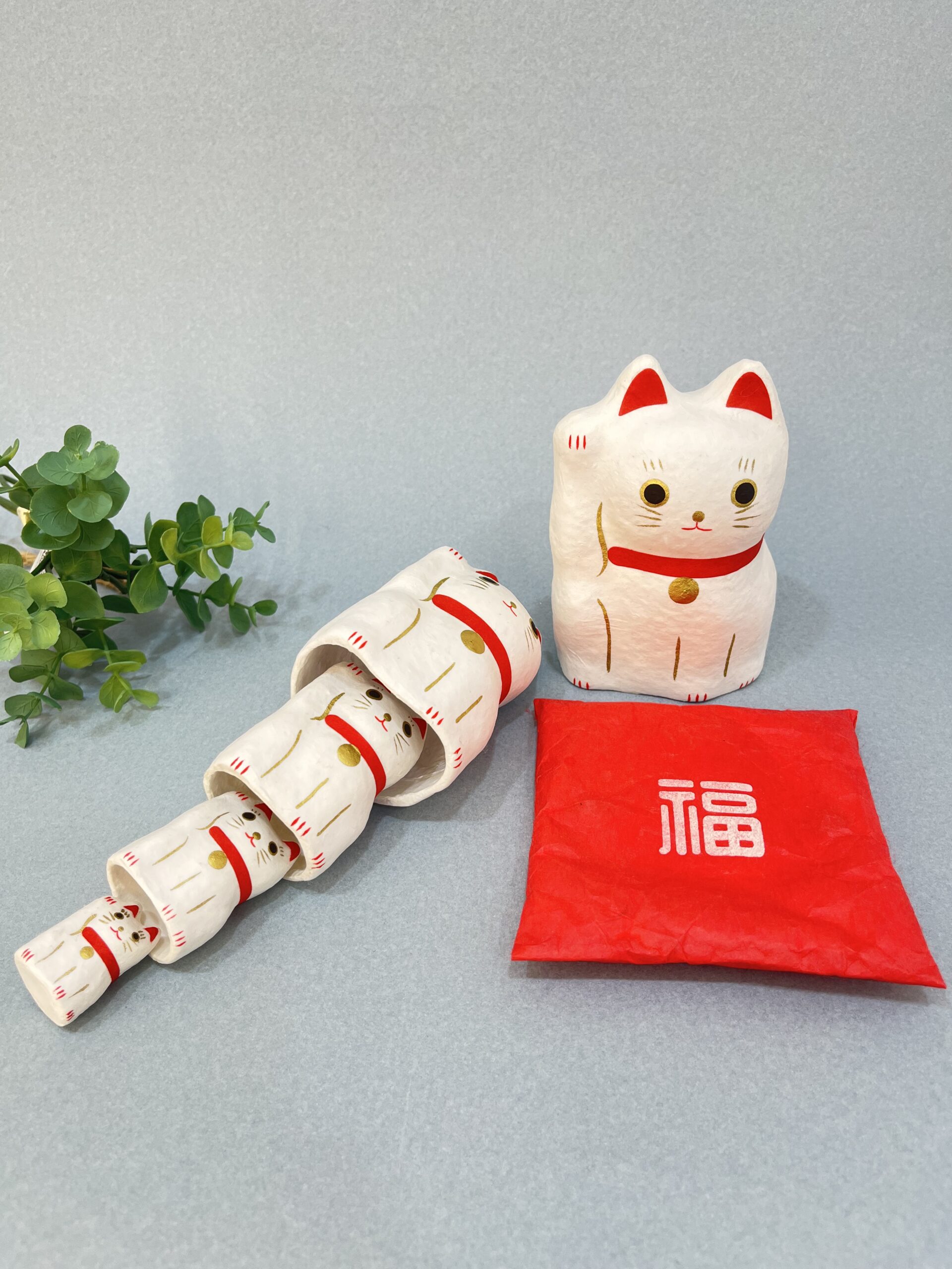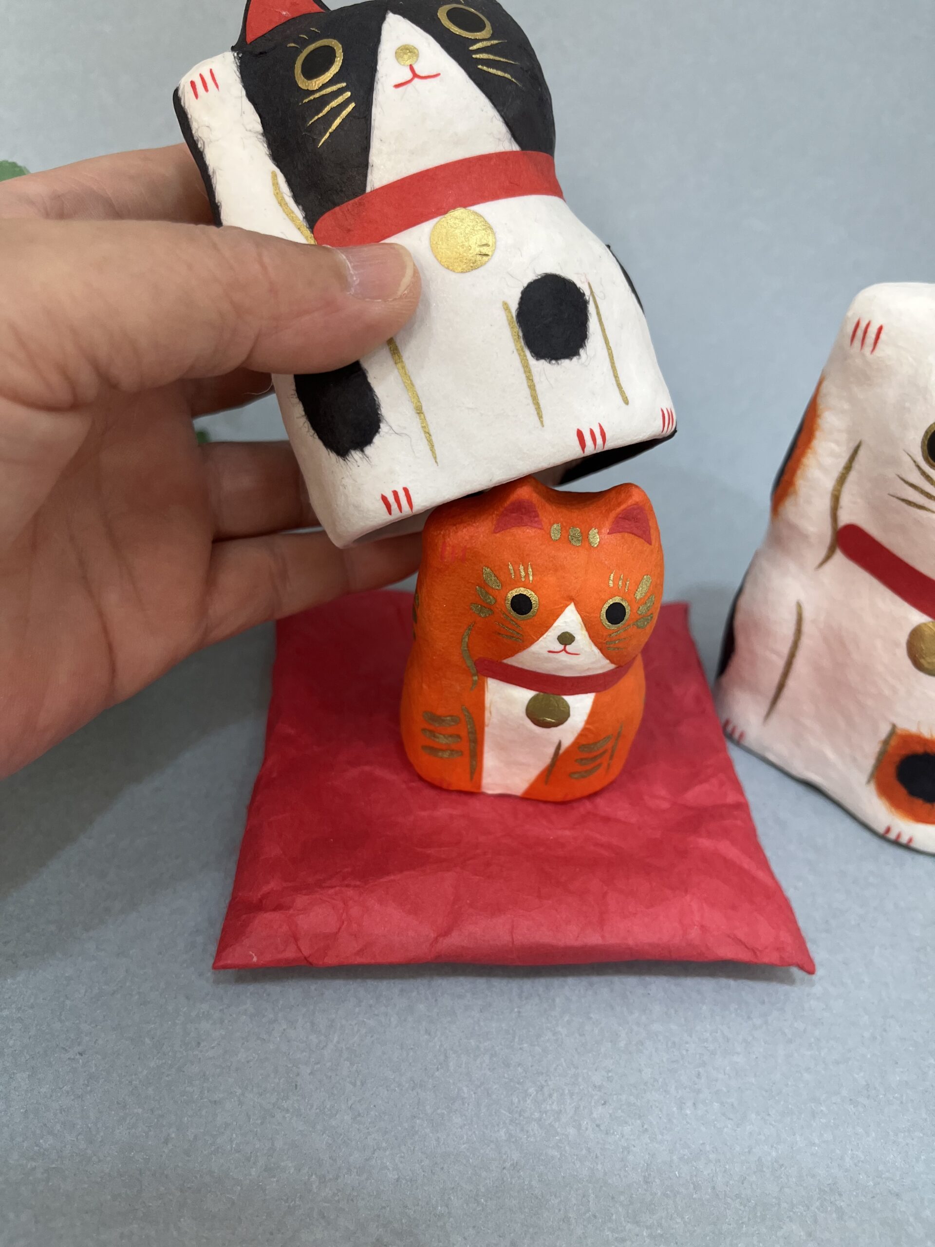 這是一個用和紙製成的俄羅斯娃娃式招財貓擺飾。